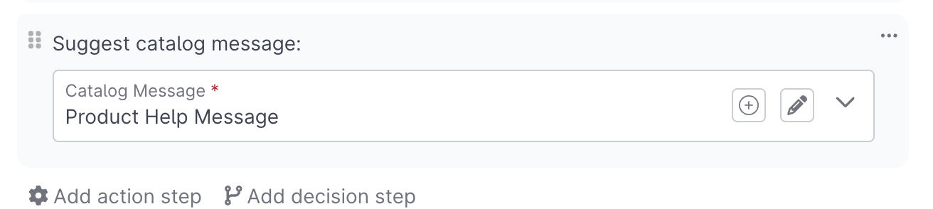 Enables you to suggest a message from the Message Catalog. Catalog messages are configured outside of AI Projects and can be leveraged in multiple different areas, including as Snippets by your human agents.