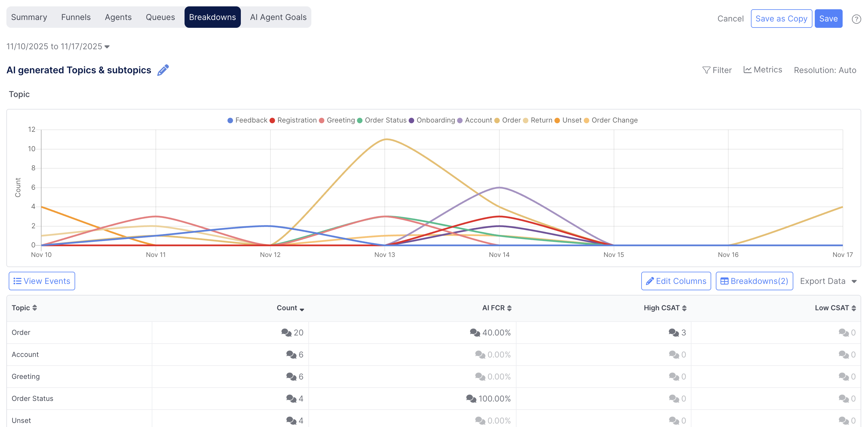 - analyze predicated first contact resolution: Estimates whether the customer's issue was likely resolved and they won't need to contact support again.
