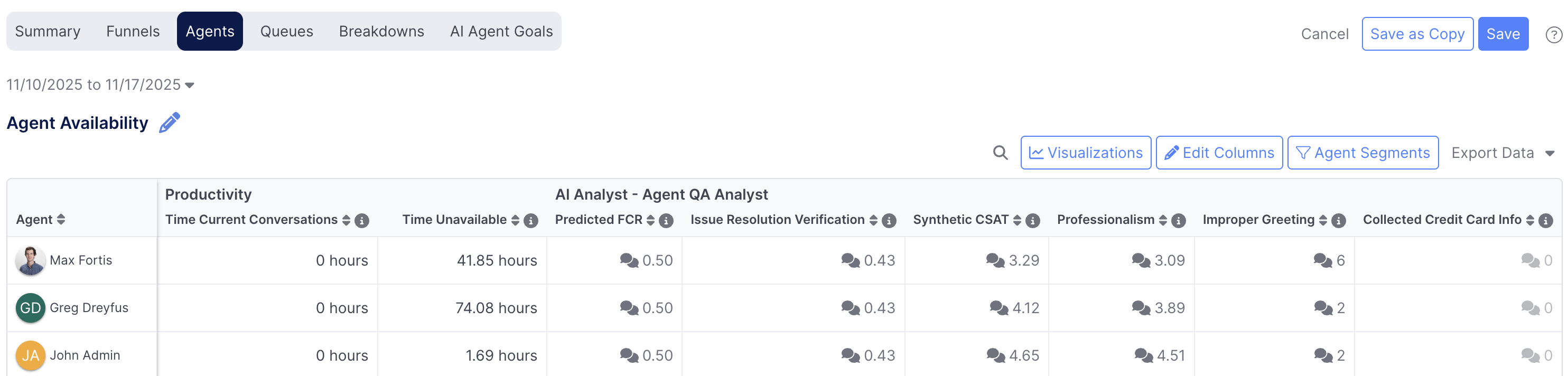 You can modify these prompts as you see fit, or add your own, refer to the Conversation Analysts article for instructions on building metrics to analyze human agent performance from scratch. The metrics generated by the Agent QA template will appear as selectable columns within Agent Insights.
