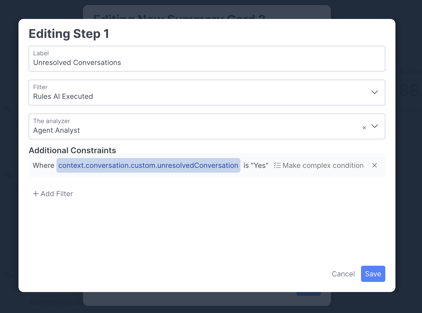 The fields that you've set can be easily integrated into your Cards, Funnelsand more . Simply Filter based on Rules AI Executed, then select the Real Time Conversation Analyst, and the filter based on the Field you'd like to report on: