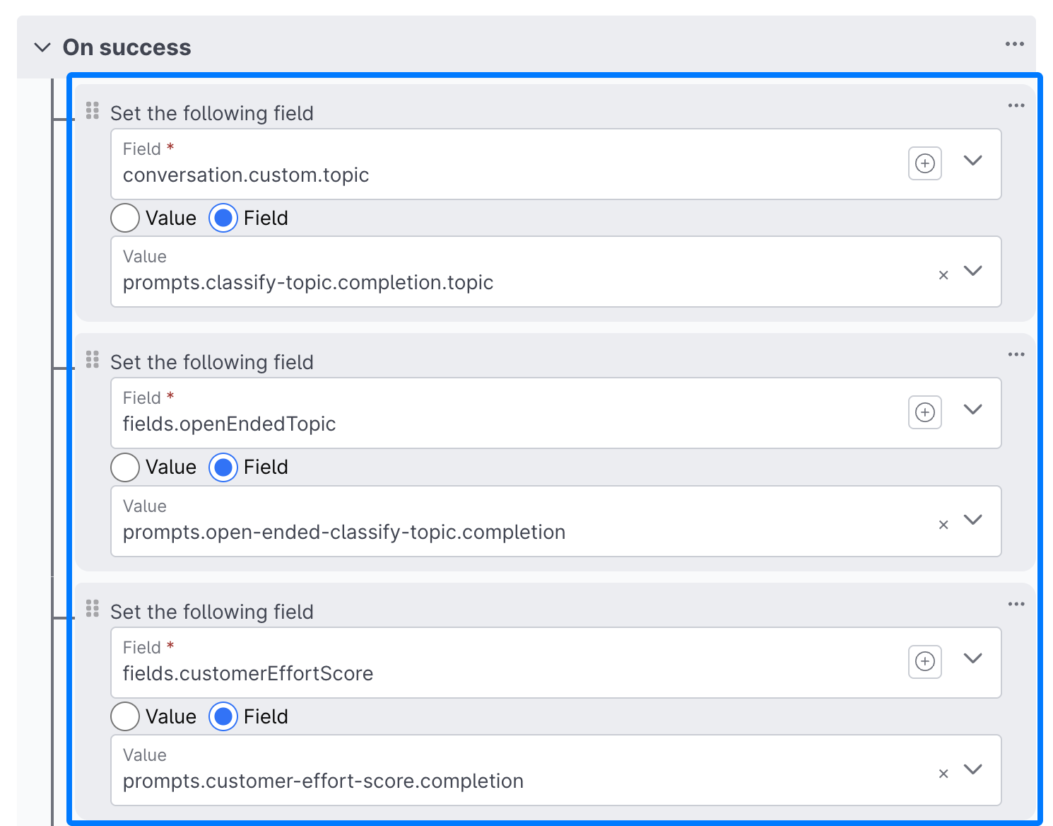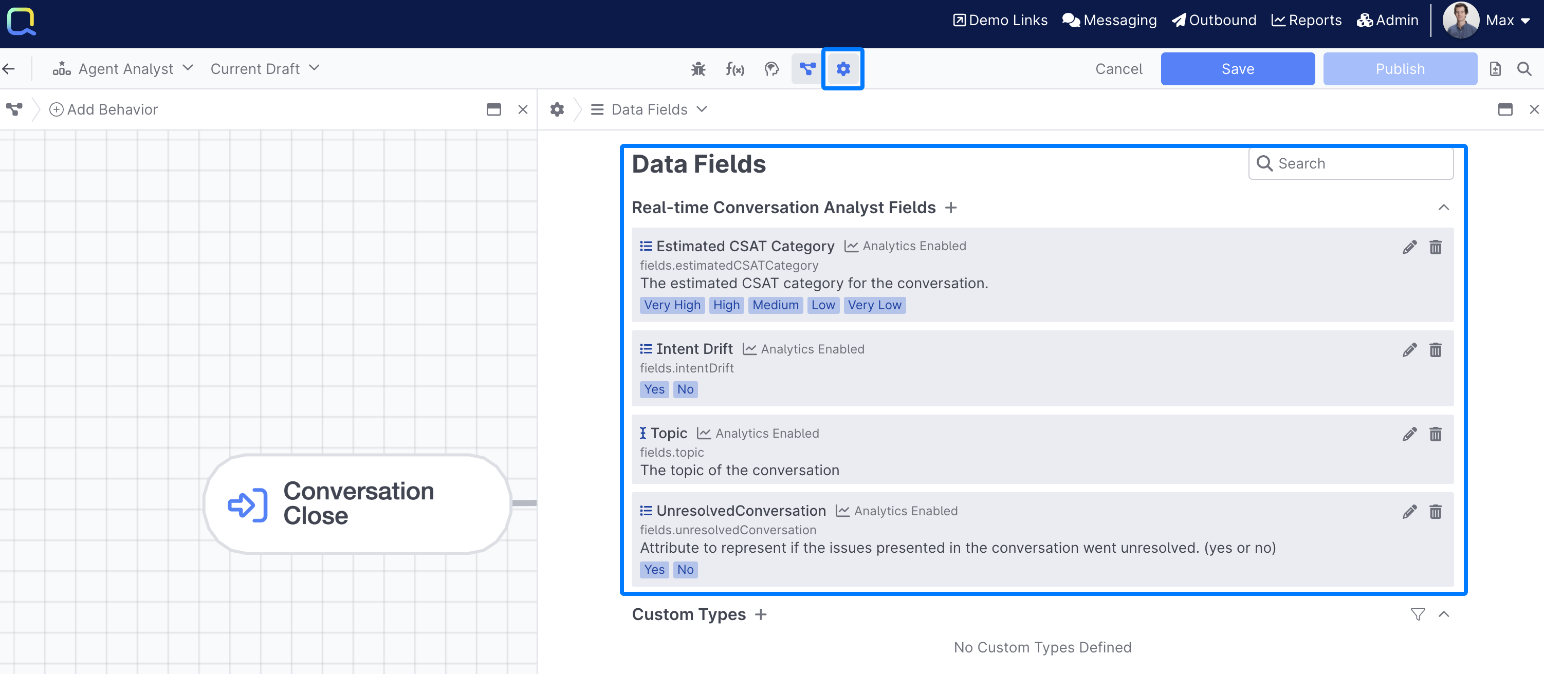 Once you've got your prompts created, you'll need a way to store your prompt completions. You can do this either by creating new Conversation Analyst specific fields via the Fields option in the Configuration Panel, or by leveraging new or existing Conversation Custom Fields, that map to each of the prompts you're creating: