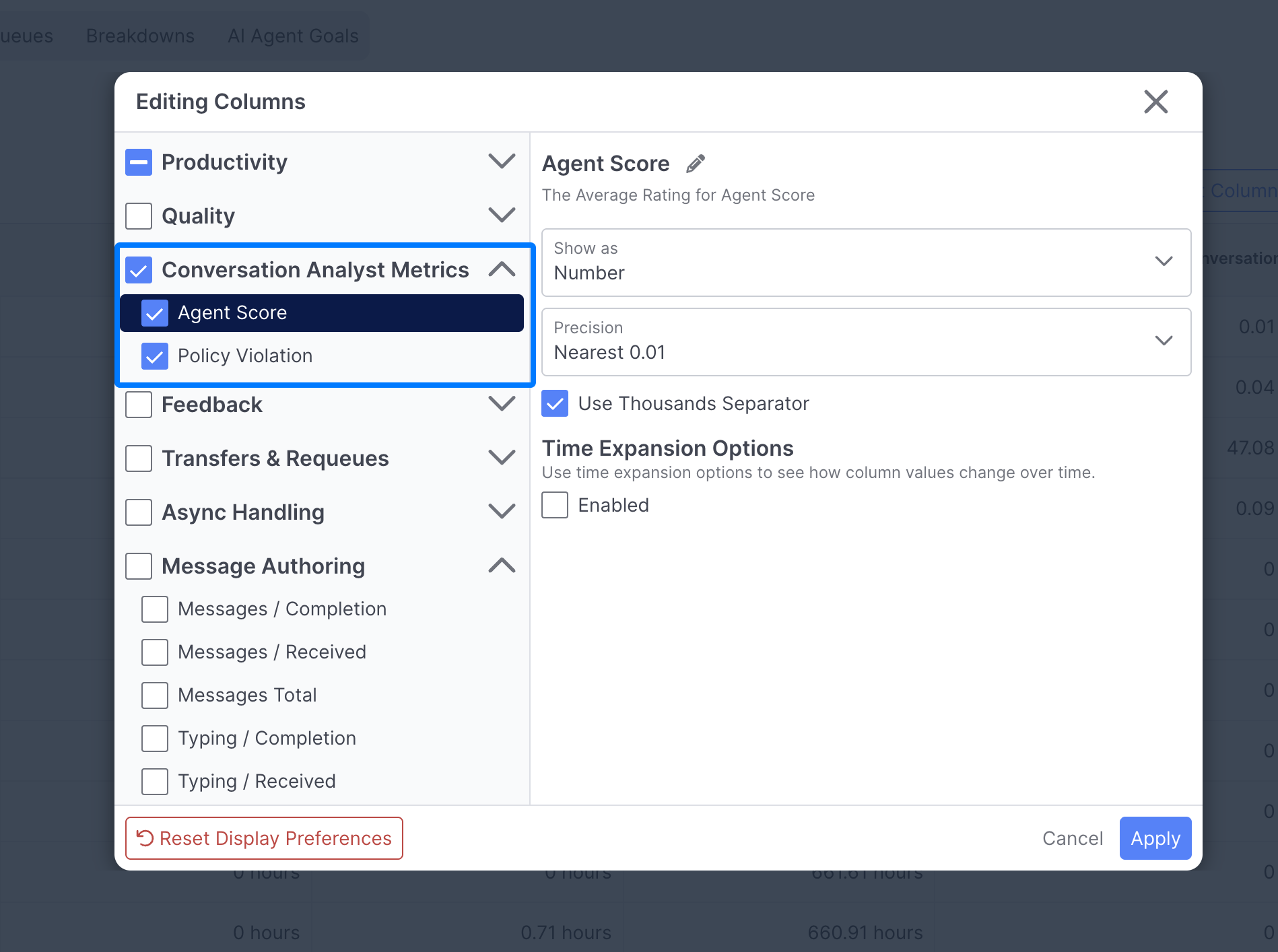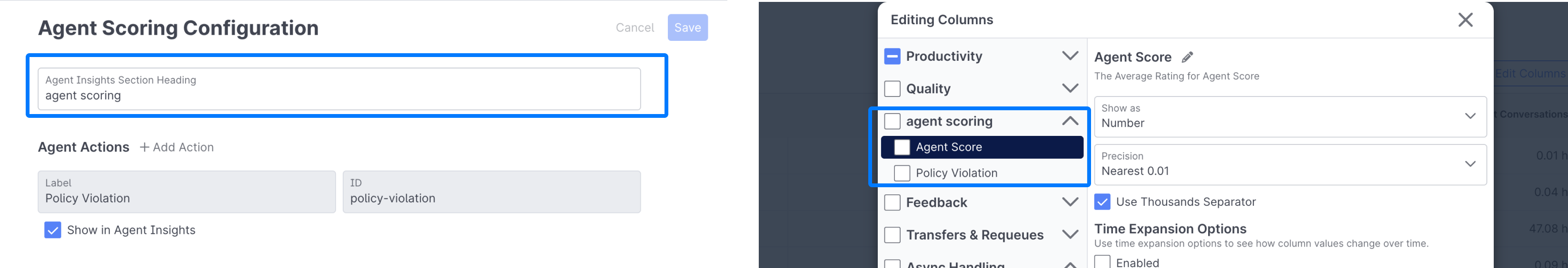 To integrate your scores into Agent Insights, ensure you've followed the steps outlined in the generating human agent metrics section. Once configured correctly, you will see them appearing as columns in your Agent Insights views: