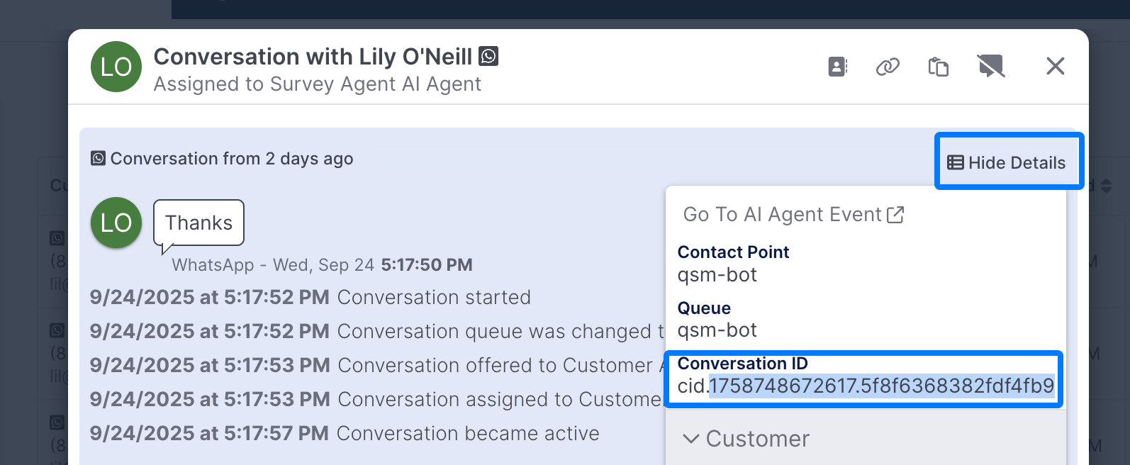 Finding a Conversation IDYou can easily grab CIDs by opening up a Transcript and selecting the View Details button next to a conversation: