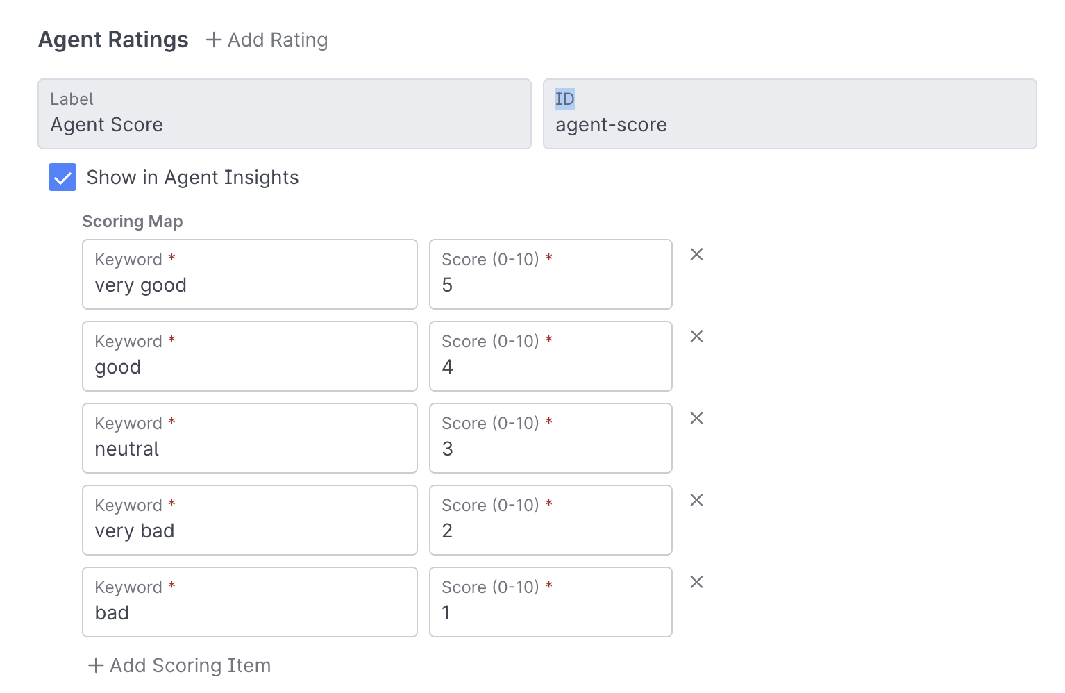 Agent Ratings: Agent ratings are 0-10 score ratings that are great for grading agents on your specific criteria, like whether they used the proper greeting, how closely they adhered to a given policy, and much more: