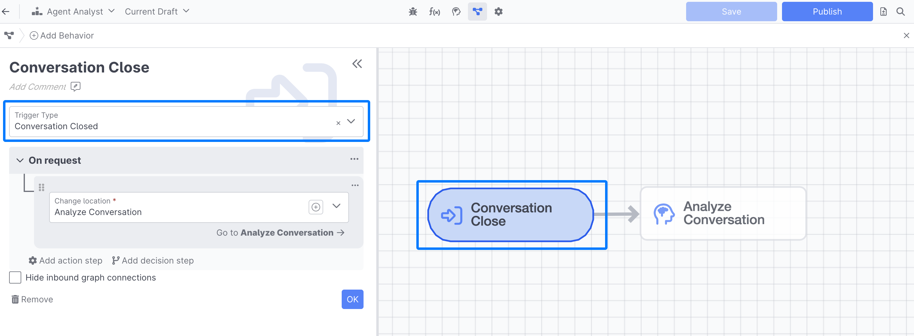 Conversation Analysts, like all other AI Studio projects, start with a Trigger Behavior that initiates the Conversation Analyst. Currently the Trigger Behavior supports Conversation Closed as a Trigger Type: