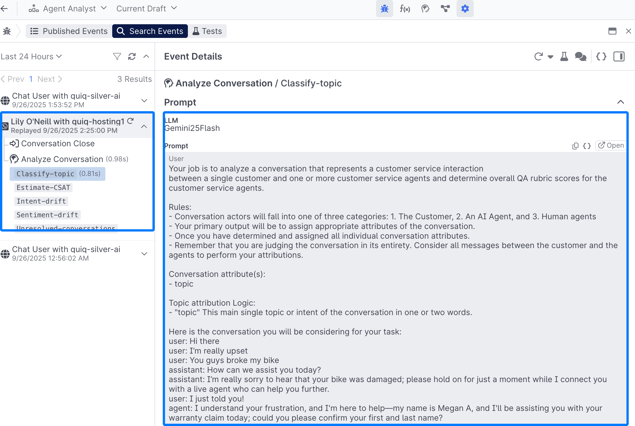 Once your Conversation Analyst is live, you'll see allreal conversations show up and you can review each prompt and prompt completion to ensure your analyst is behaving as expected. Learn more about Debug Workbench.