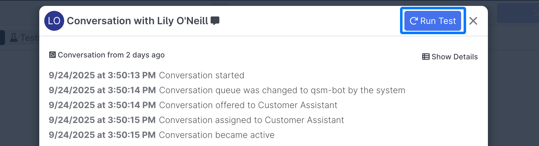 Once you've done that, the conversation will show up in the event list, open it up and click the Run Test button: