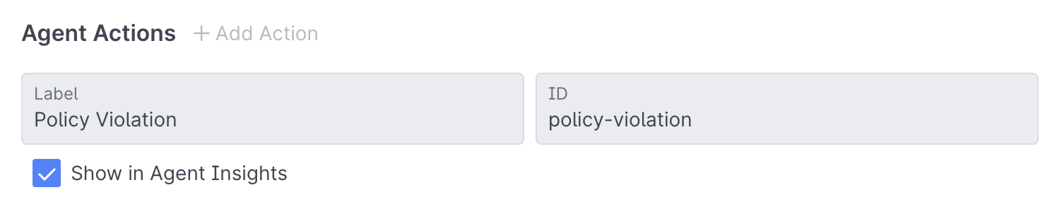 Agent Actions consist of a Label, an ID, and a checkbox for whether or not you want that action to appear in Agent Insights: