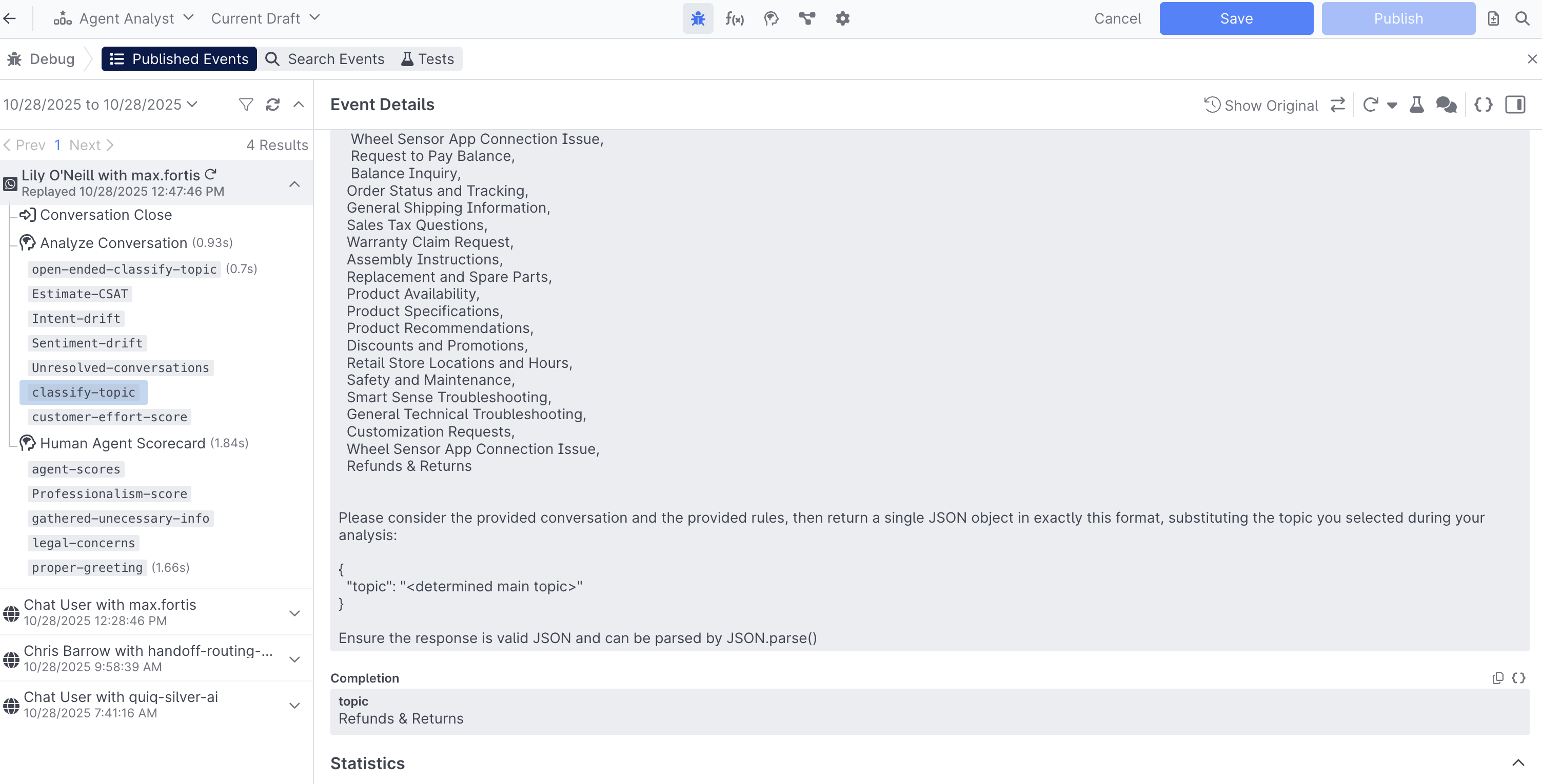 Learn how to test your Conversation Analyst, analyze and tweak prompts, and create reusable tests.