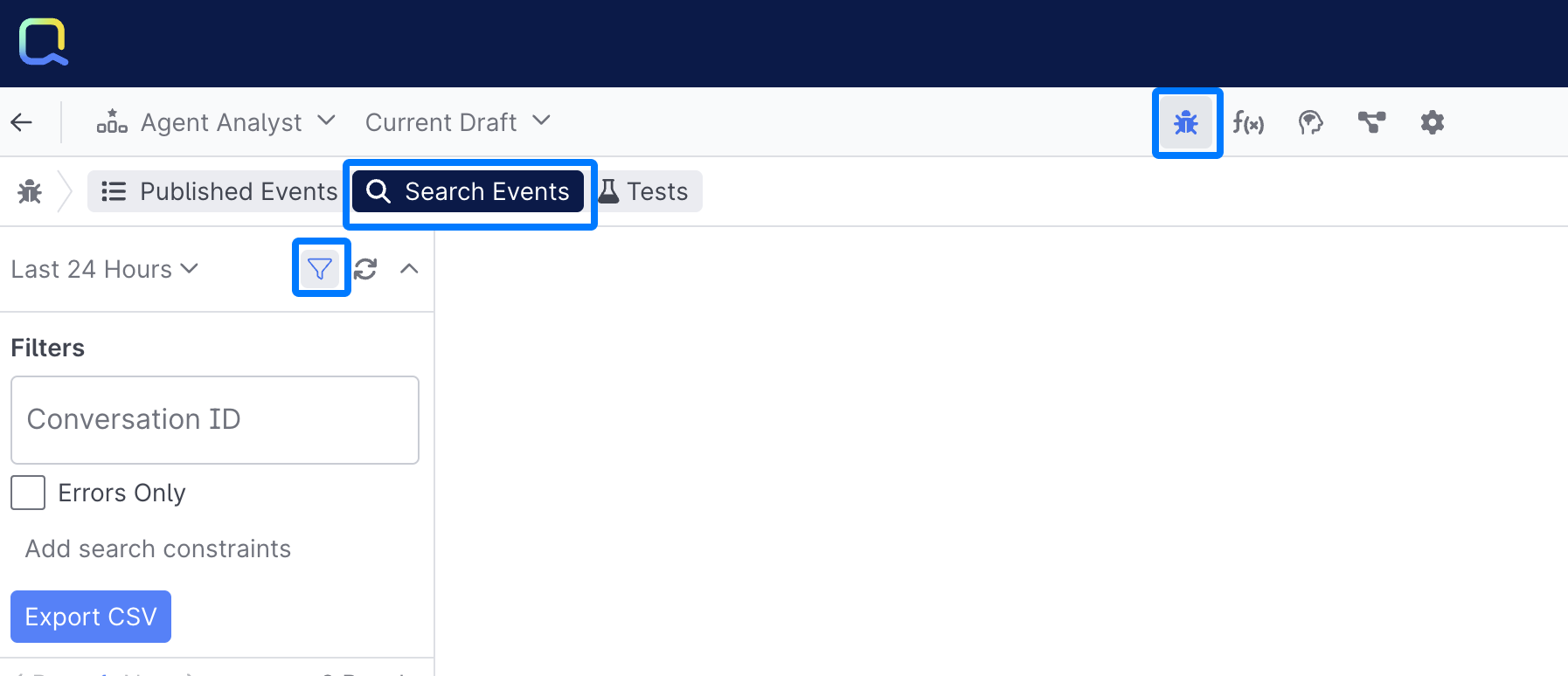Now that you've got your Conversation Analyst successfully configured you'll want to run it against real conversations to see how it analyzes them. Open up the Debug Workbench and click Search Events, next open the Filter icon to search by a Conversation ID (CID):