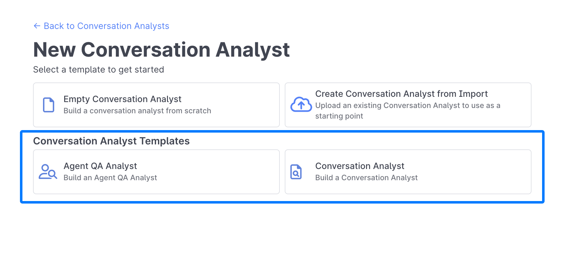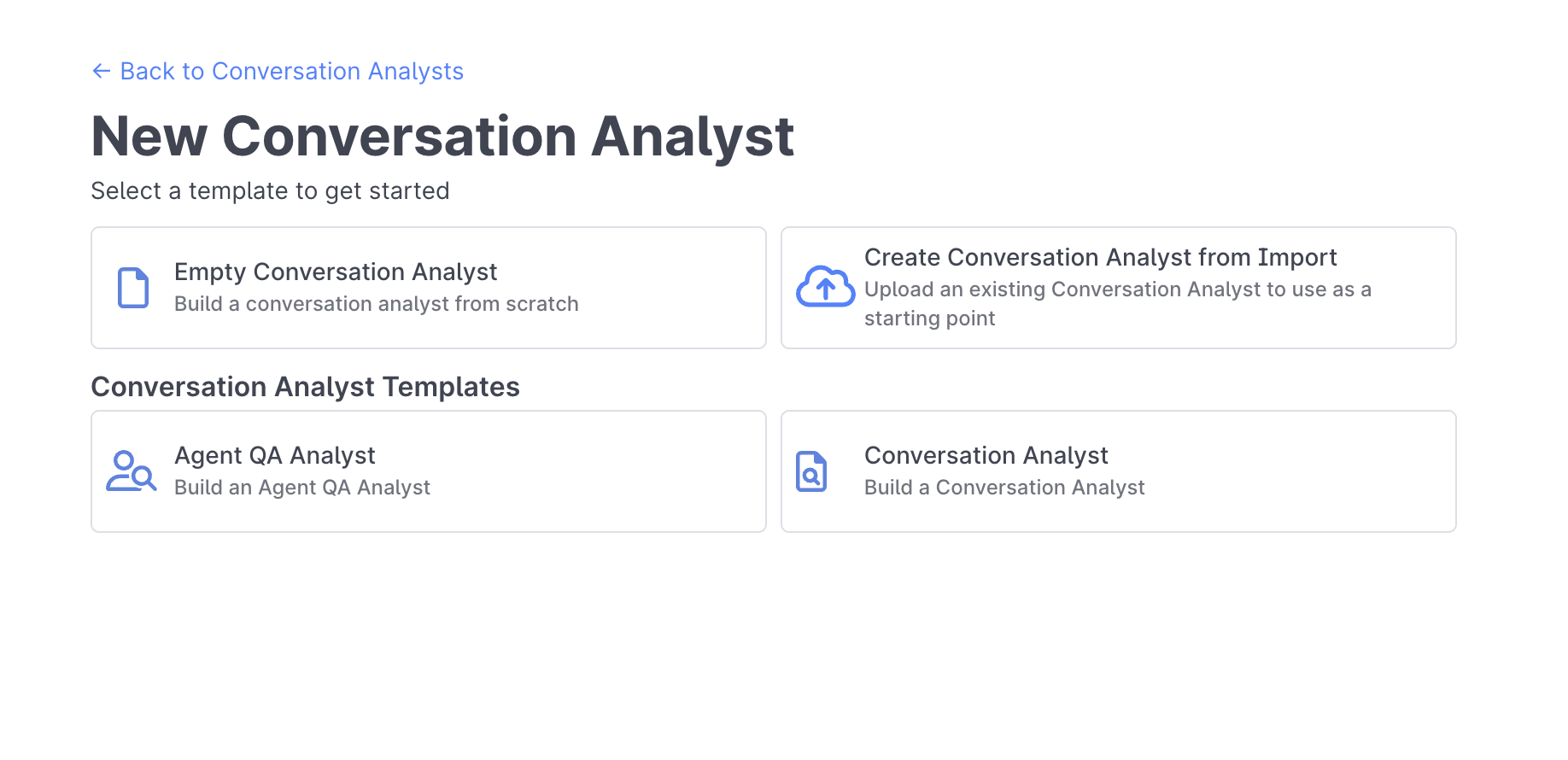 Conversation Analysts have a series of templates you can use to get started with, learn more about the available Conversation Analyst Templates.