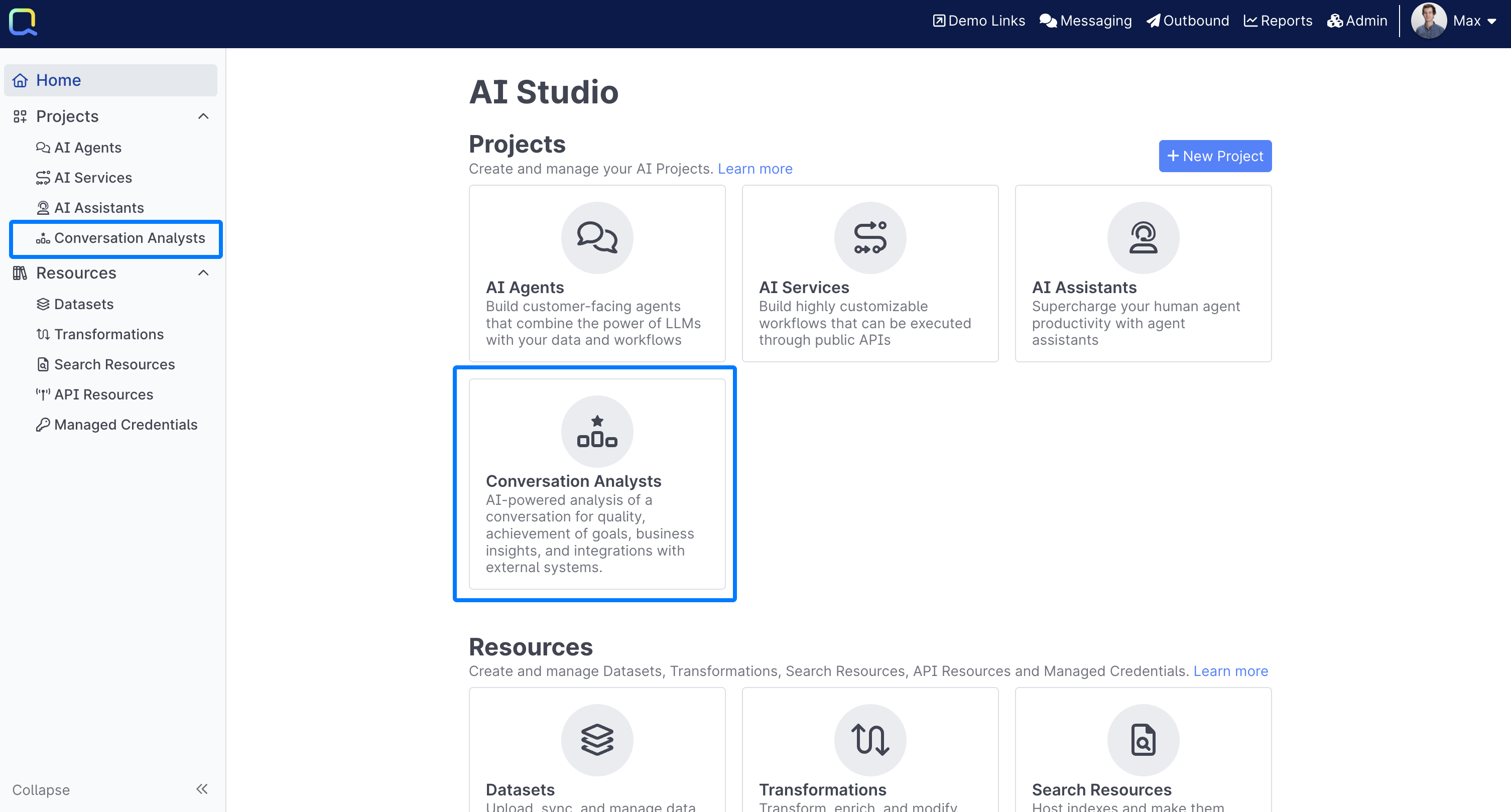 Conversation Analysts are created and managed like other AI Studio Projects, and can be created using the New Project button, or via the Conversation Analysts tab: