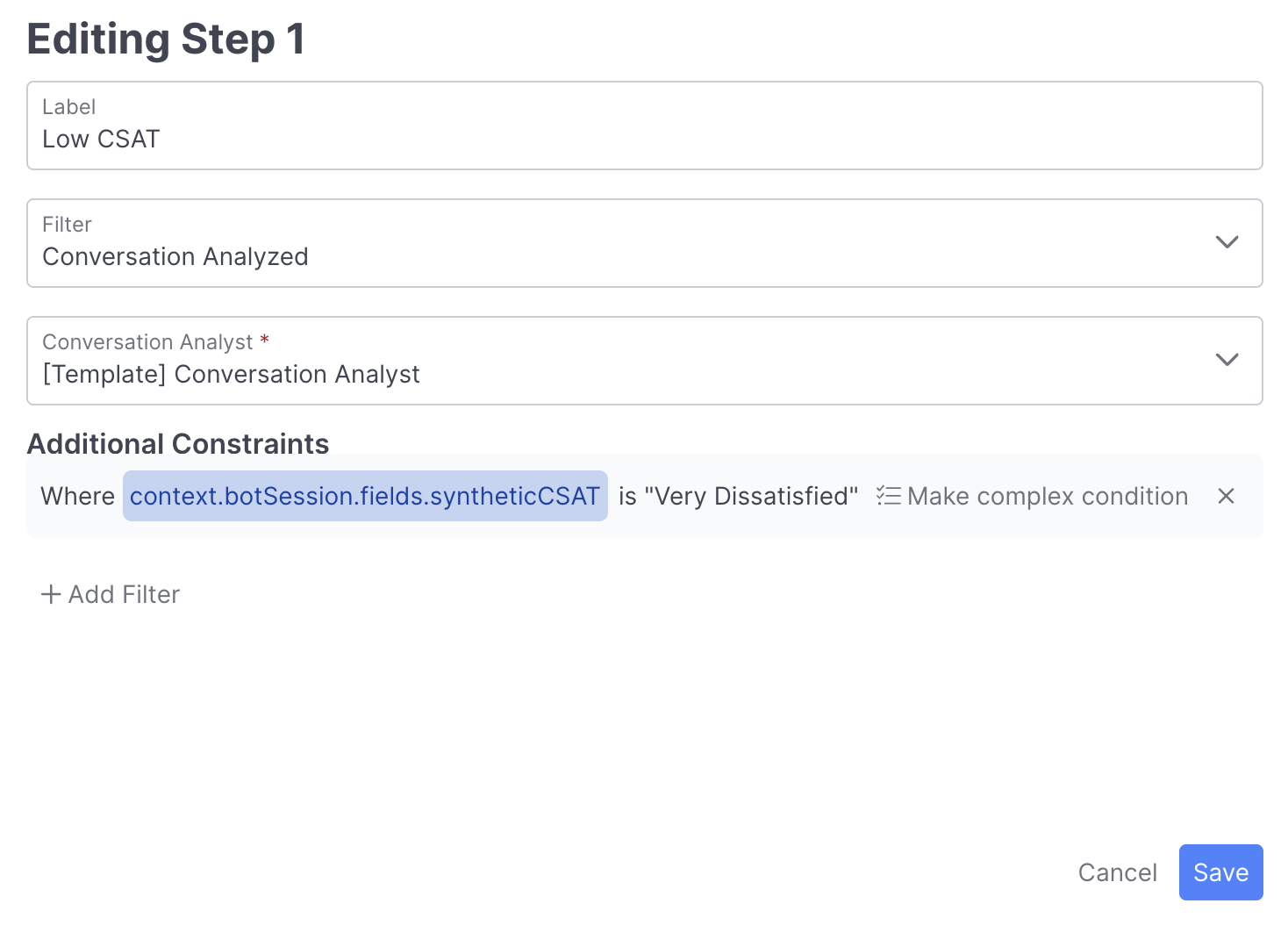 The fields that you've set can be easily integrated into your Cards, Funnels and more . Simply Filter based on Conversation Analyzed, select your Conversation Analyst, and the filter based on the Field you'd like to report on: