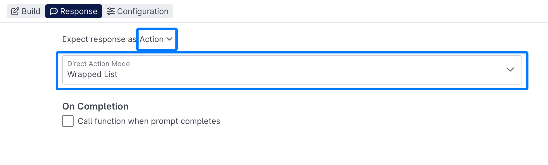 Under the Response tab, you'll want to select Action for the expected response, and Wrapped List for the mode: