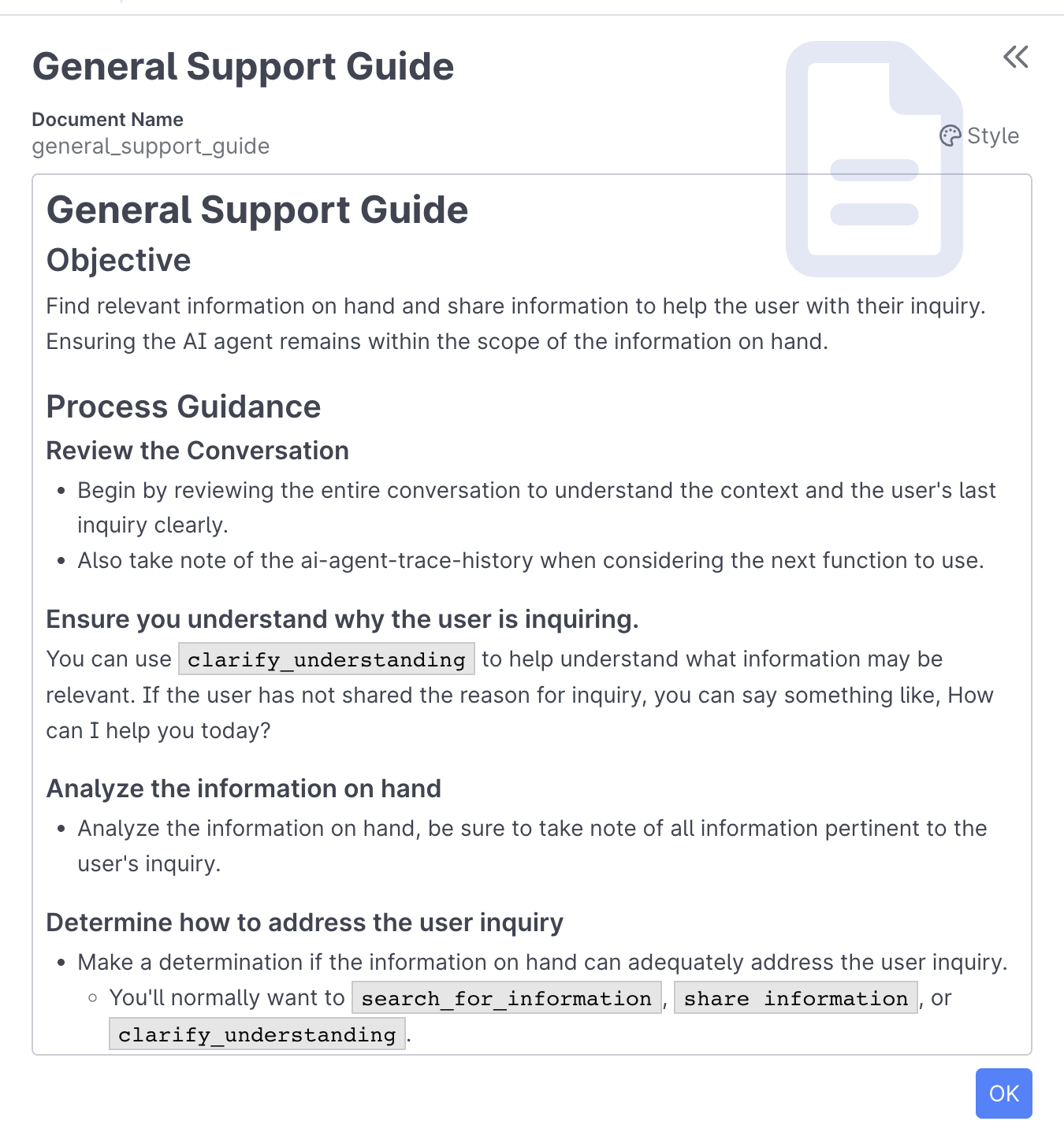 The Document behavior allows your AI Agent, Assistant, or Service to reference a Process Guide or other content throughout the experience. Documents are written using natural language and can be referenced in the Function Editor.