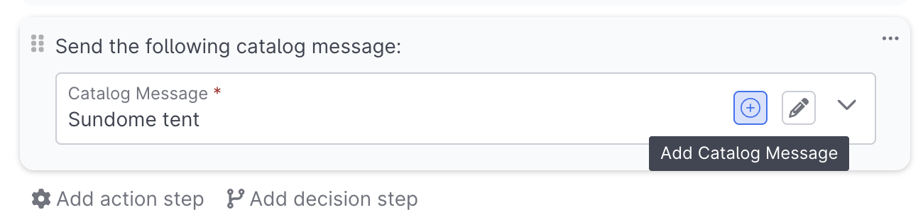 Enables you to send a message from the Message Catalog. Catalog messages are configured outside of AI Agents and can be maintained by less technical users. They are useful for static messaging content (w/ Variable Support) such as legalese or seasonal promotion content.