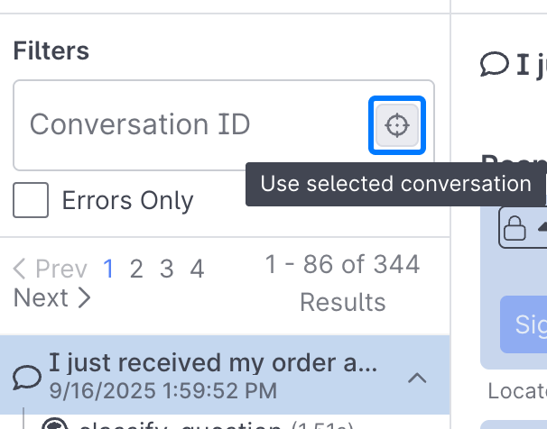 You can use the date selector, Conversation ID filter, and Errors Only checkbox to further refine the events that show up:
