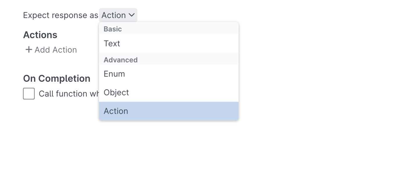 By default, every prompt's completion is treated as text. Its text value is available to decision off of in the Flow Editor, or to be used inside of another prompt as a slot. Sometimes it's useful or necessary to add more structure to a prompt's output, or to use code to perform some postprocessing on the model's completion. The Response Tab enables both of these optional features.