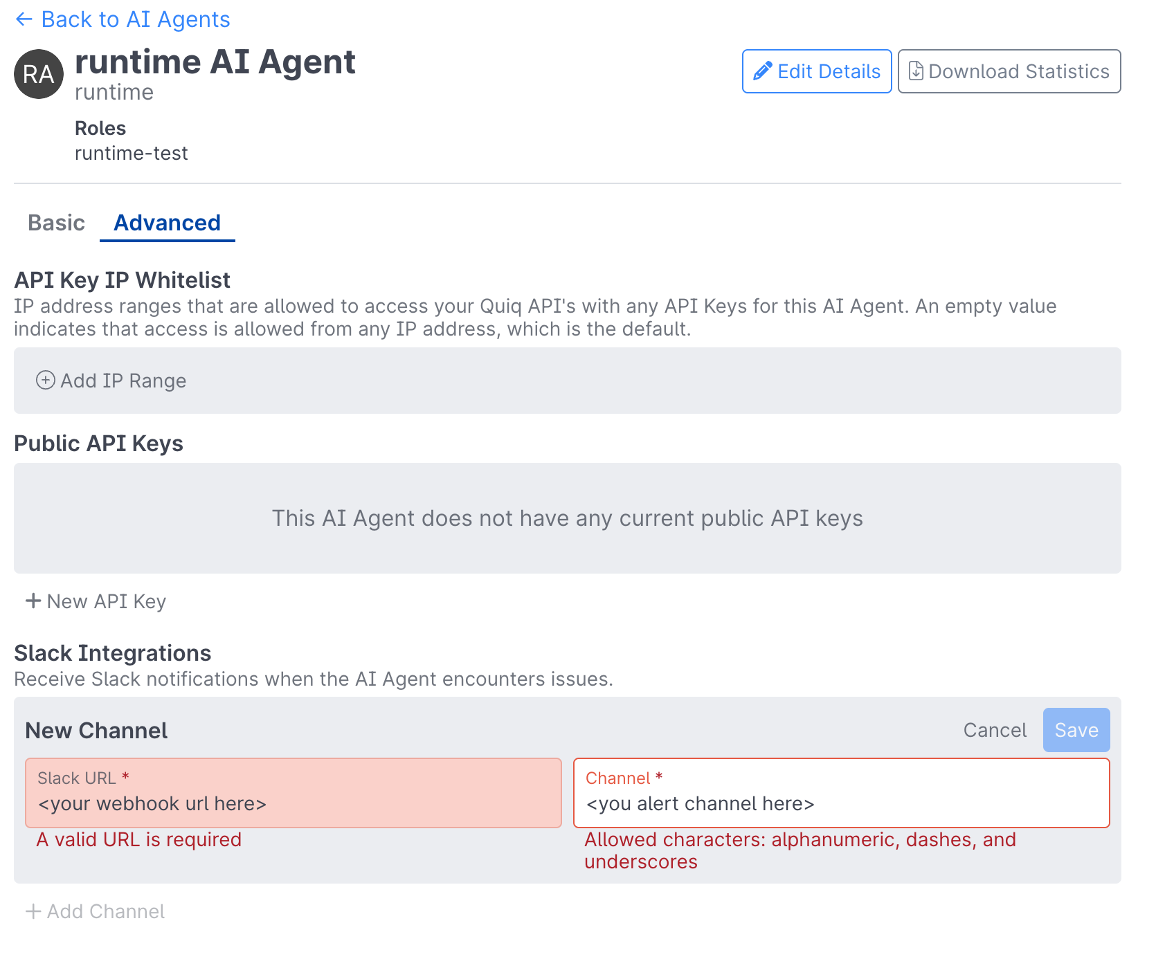 Alerts will only be pushed for errors that occur on the published version of your agent (no alerts are posted for errors that occur while a builder is working in AI Studio). You can verify that your slack alerting is working correctly by taking the following steps