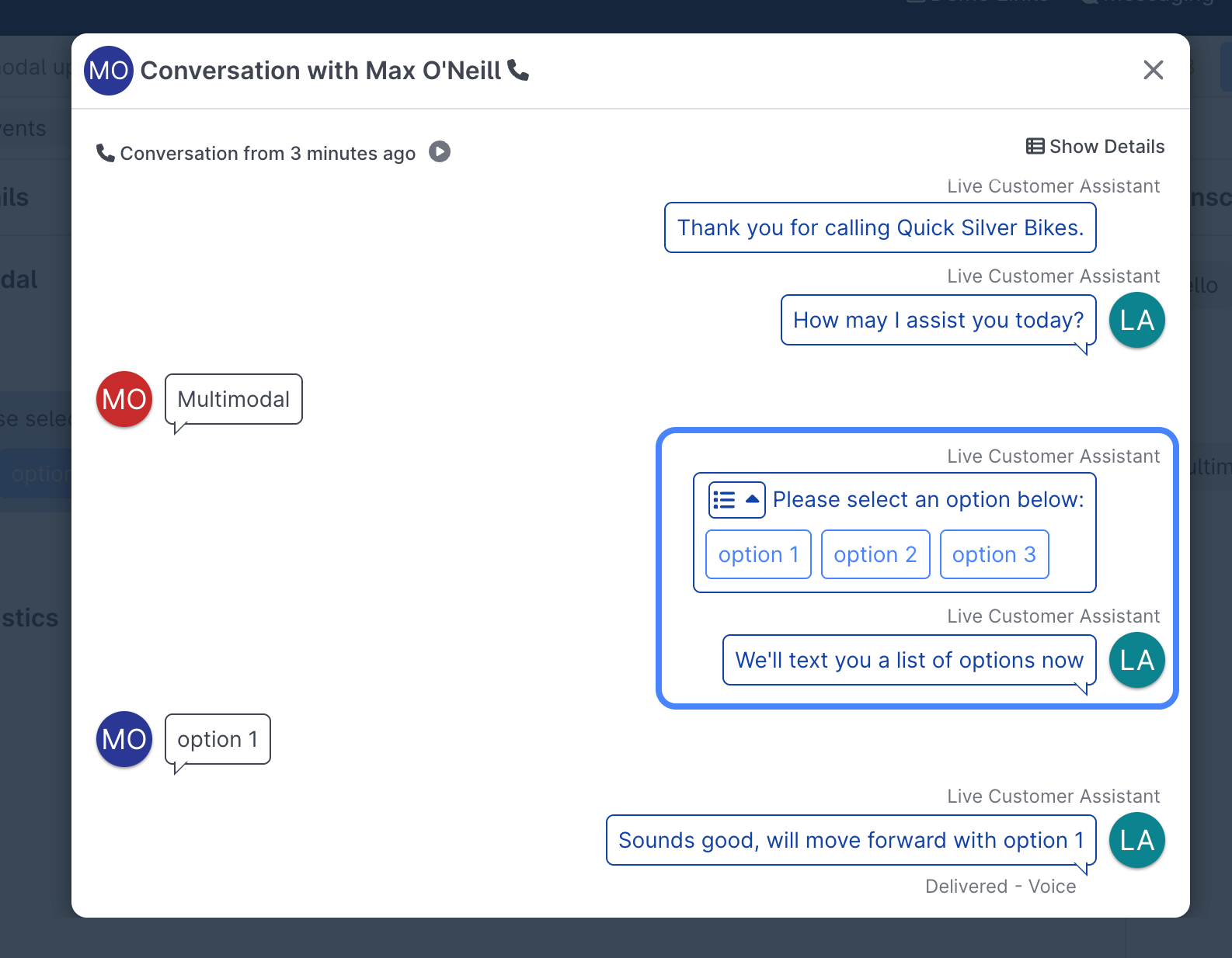 When viewing a multimodal transcript, both the voice and messaging portion will appear side by side, so no context is lost: