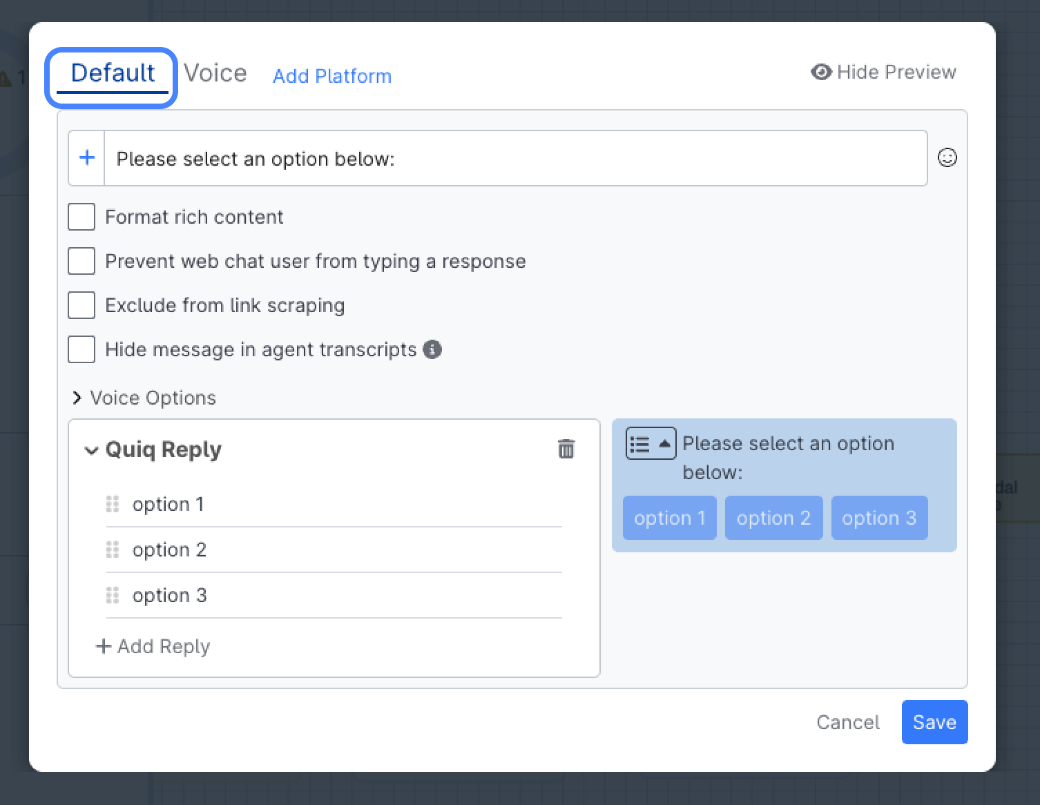 Lastly, click back over to the Default tab and define the message you'd like to text during the conversation: