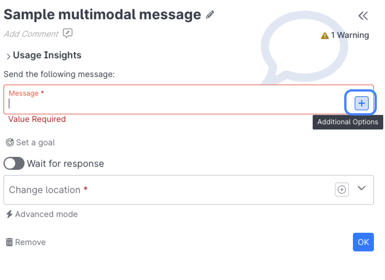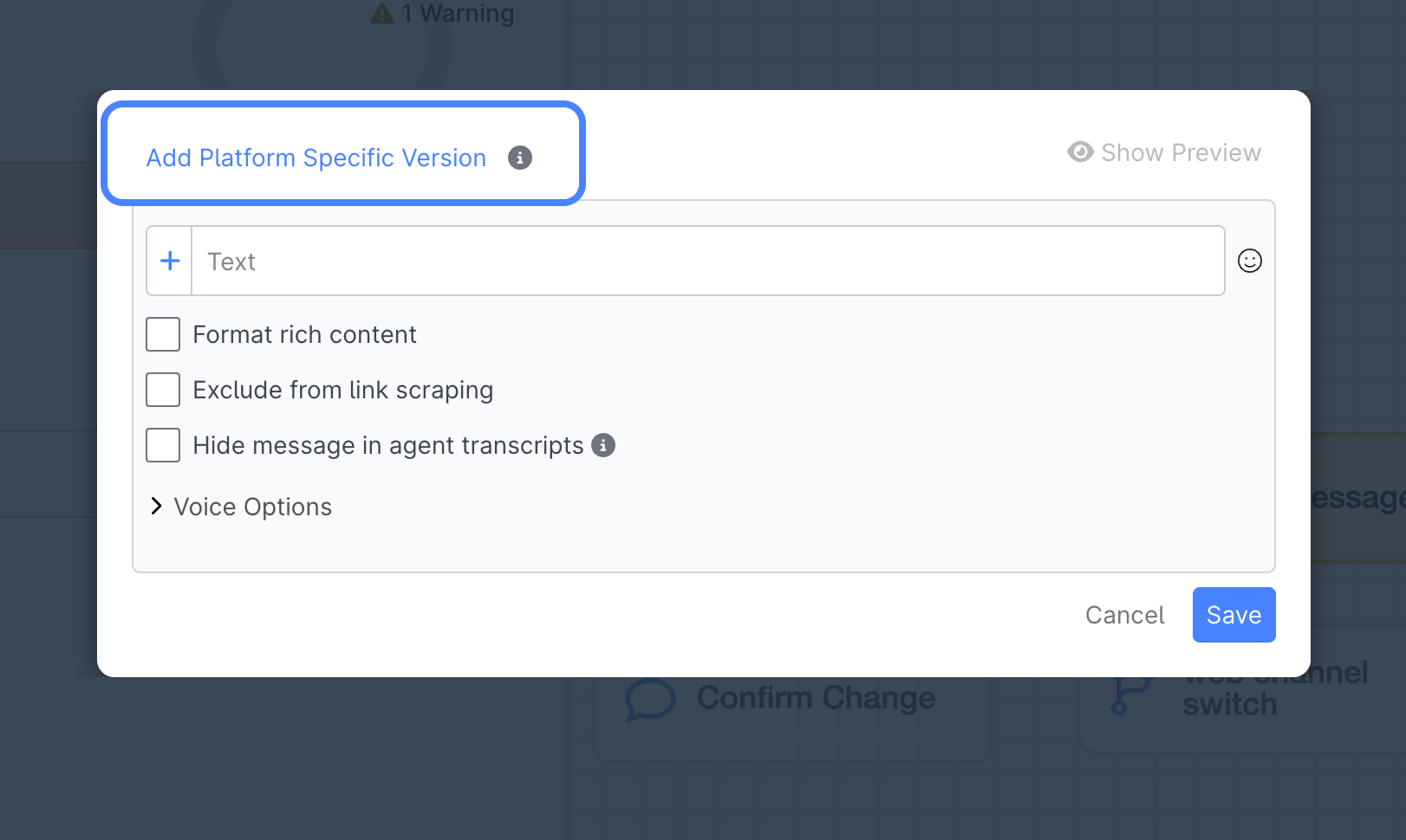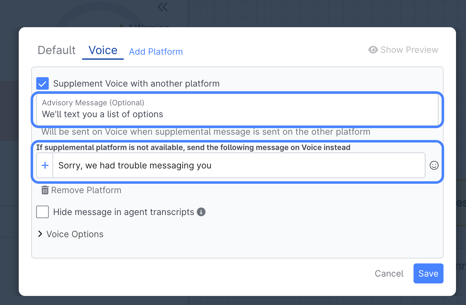Define the Advisory Message you'd like to be spoken over Voice, and define the message you'd like spoken if the messaging channel is not available: